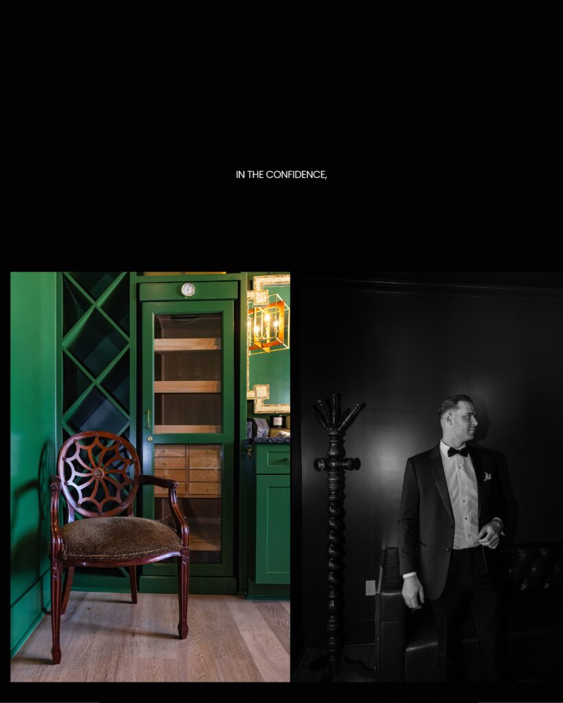 At Hewitt Oaks — a venue where Southern heritage meets Parisian restraint — the groom steps into the green cigar lounge. The room carries weight. Texture. History. It asks nothing of him except presence.