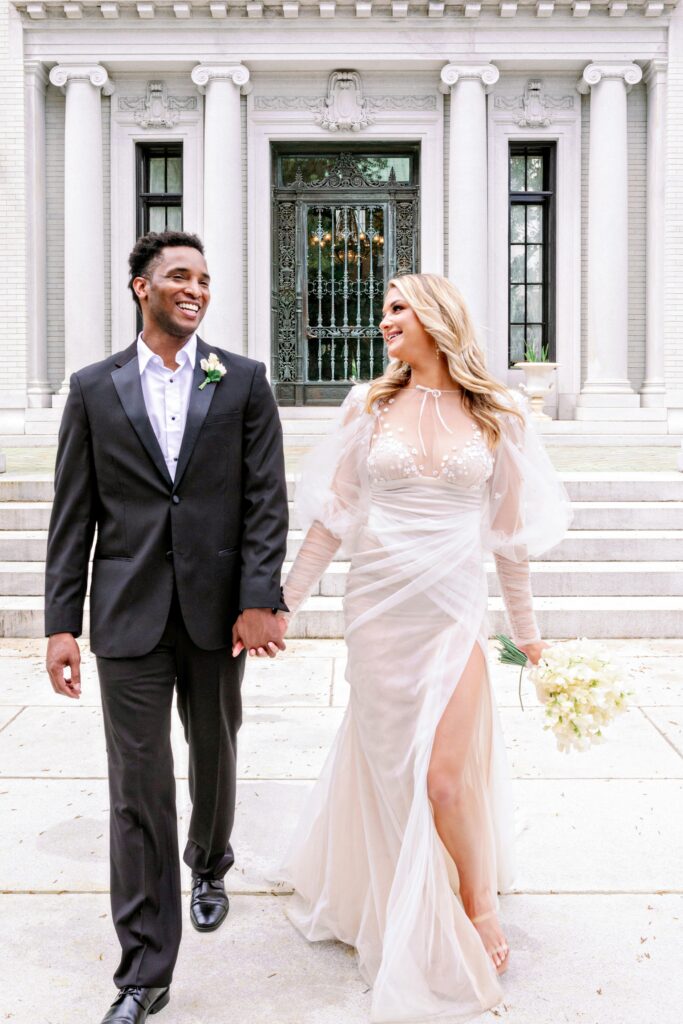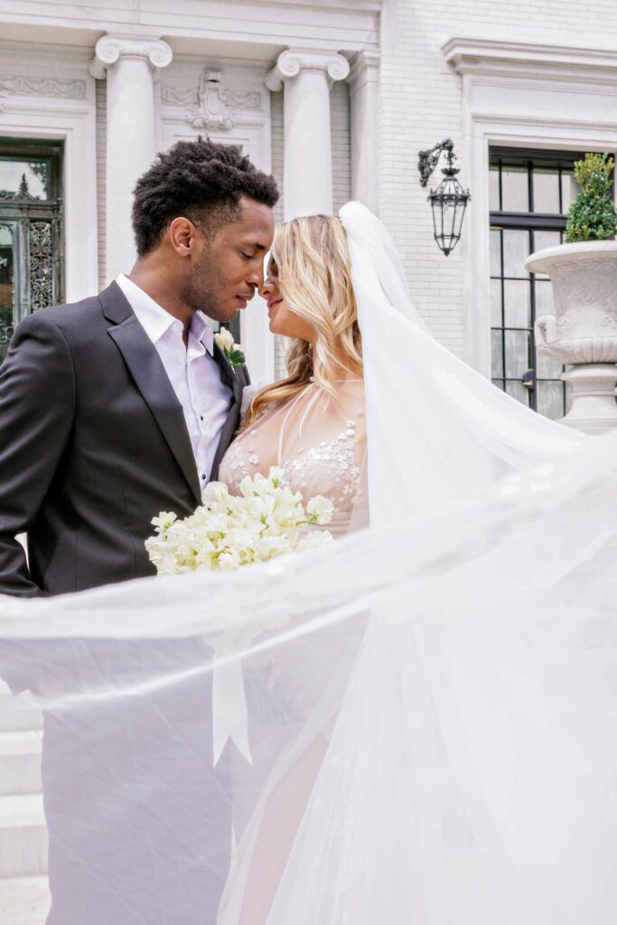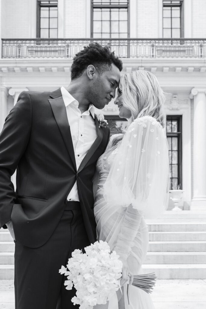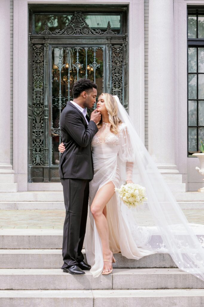 A couple embracing outside of the Armstrong Kessler Mansion in Savannah