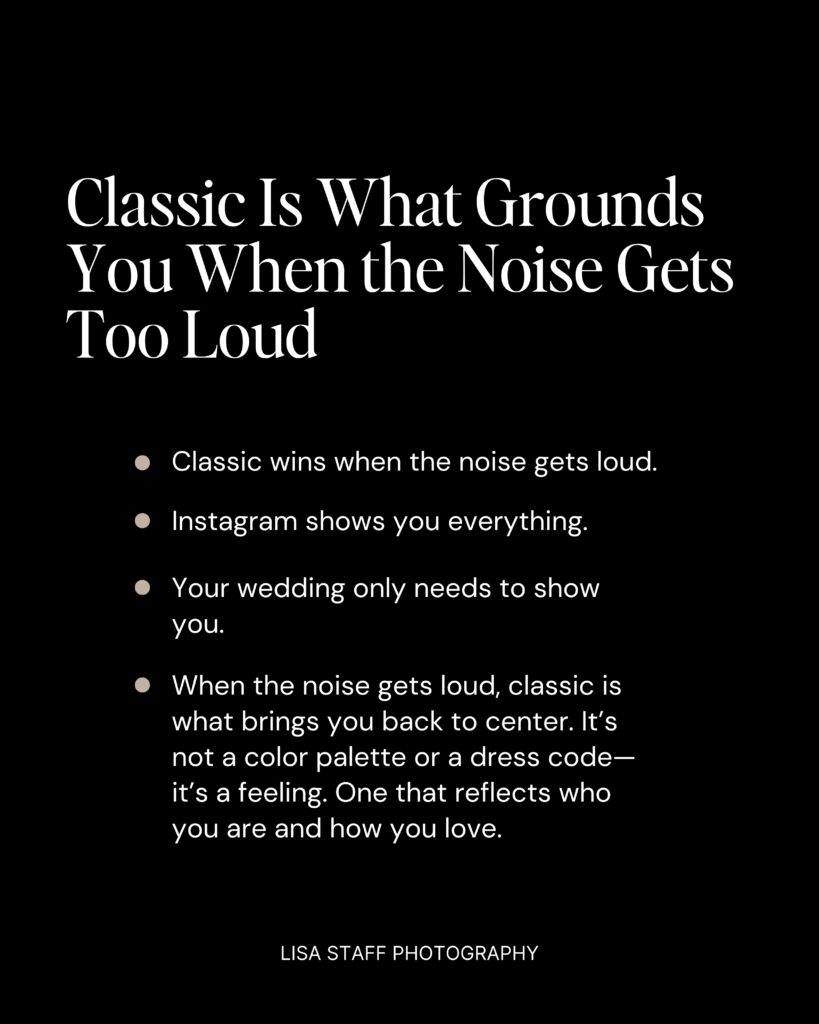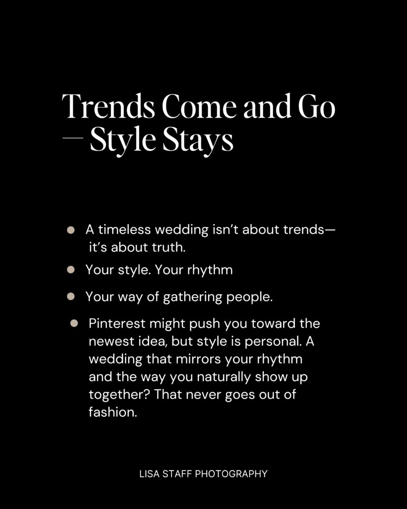 Pinterest might push you toward the newest idea, but style is personal. A wedding that mirrors your rhythm and the way you naturally show up together? That never goes out of fashion.